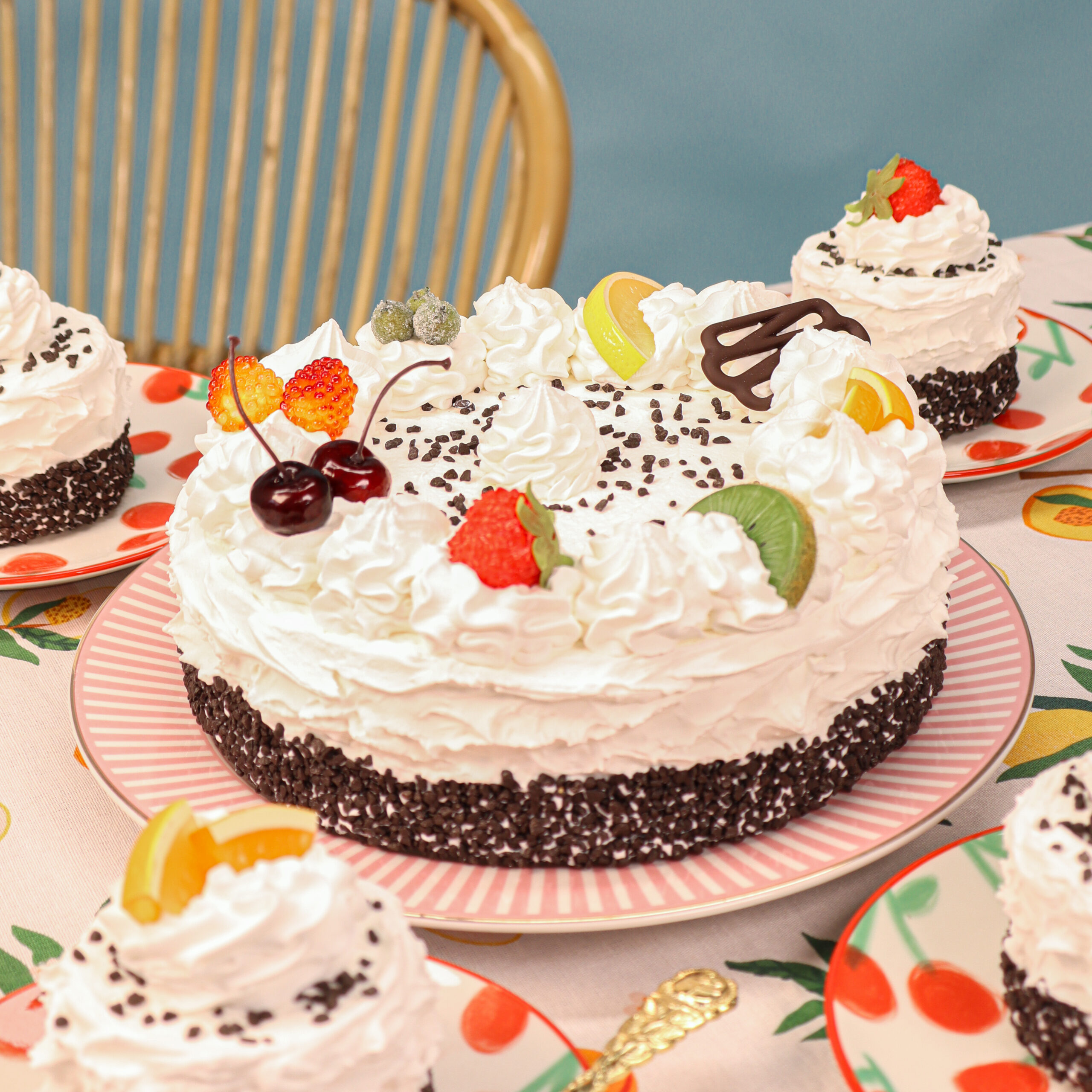 Bovenop de taart bevinden zich royale slagroomtoefen van kunstslagroom.